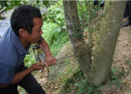 用半斷桿法促使沉香樹快速結(jié)香的方法,是在離沉香樹干基部1米以上的樹干上鋸一個傷口,傷口的深度約為沉香樹干直徑的1/3至1/2。沿著沉香樹干同一個方向的不同高度,按照以上方法再多鋸幾個傷口,傷口與傷口之間的間距約為30-40厘米左右,傷口寬度約為1厘米左右。